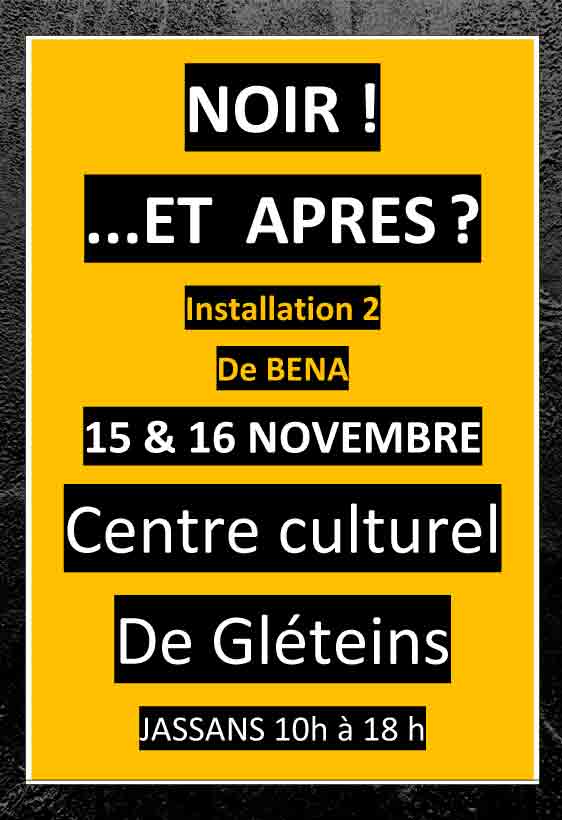 Deuxième phase de l’exposition « Noir ! …et après ? » LES 15 ET 16 Novembre au Centre Culturel de Gléteins. Ouverture exceptionnelle à 20 h le mercredi 19 novembre lors du concert de Jacinthe dans le cadre des Nouvelles voix en beaujolais et lors représentations de « la Parenthèse ».