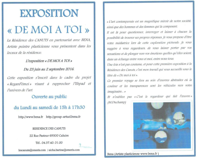 Cette exposition s’inscrit dans le cadre du tout nouveau projet « Regard’émoi » visant à rapprocher l’Ehpad et l’univers de l’art. Béna en est la médiatrice.